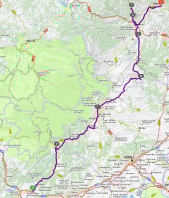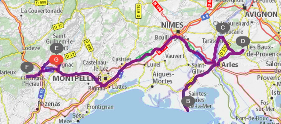 Very nice trip from our chalet in Les Marécottes through Chamonix, Valence, Alba la Romaine, Avignon, Grau du Roi, Arles, Tarascon, Ginac, Alès, Voguë, Antraigues, Vals and Logis du Roy then driving home (from Valence).